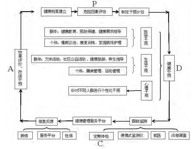 鮑勇將社區(qū)健康管理定義為: 對社區(qū)健康人群、疾病人群的健康危險因素進行全面監(jiān)測、分析、評估、預(yù)測、預(yù)防,維護和發(fā)展個人和家庭技能的全過程。