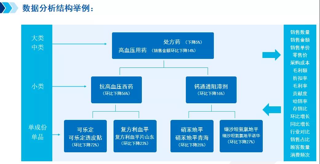 得出分析結(jié)果,提升方案就唾手可得了嗎?并不!確定了核心增長品類之后,需從整體到大類、中類、小類、單成分單品進行抽絲剝繭,基于多維逐層分析,最后才能精準(zhǔn)地制定出提升方案。