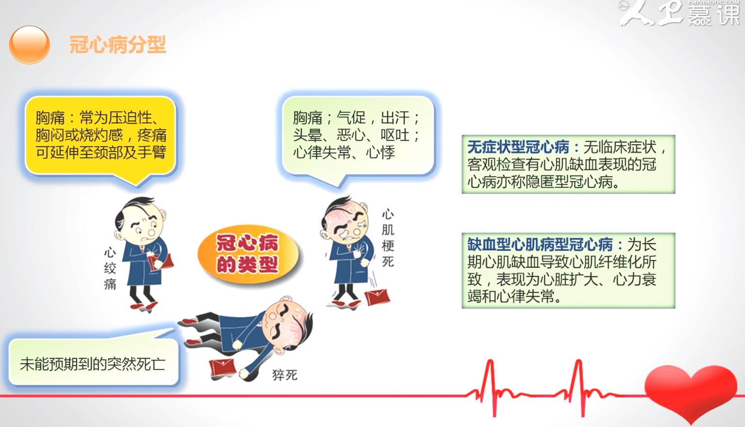 2. 心肌梗死型冠心病: 在冠狀動(dòng)脈病變的基礎(chǔ)上,發(fā)生冠狀動(dòng)脈供血急劇減少或中斷,使相應(yīng)的心肌嚴(yán)重而持久地急性缺血導(dǎo)致心肌壞死,表現(xiàn)為嚴(yán)重持久的胸痛、氣促、出汗頭暈、惡心、嘔吐;心律失常、心悸等。